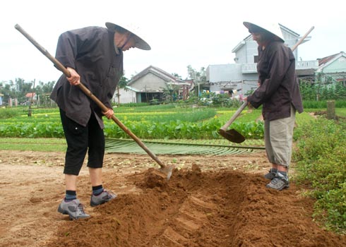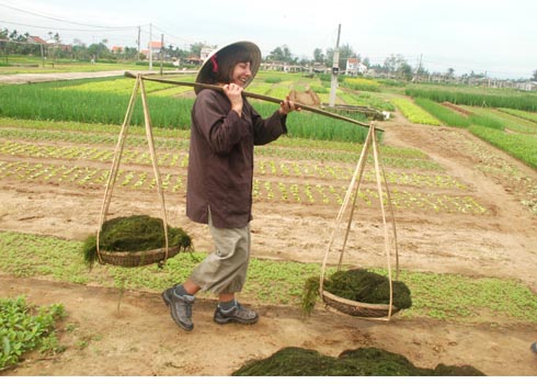 Through an interpreter, Poter carefully observed the instructions of Mr. Ba, a farmer of Tra Que village, on how to hold farm tools, how to hoe land to make beds in straight lines, how to use two bamboo-made shoulder poles to carry two iron baskets of seaweed to the field as fertilizer before growing vegetable.